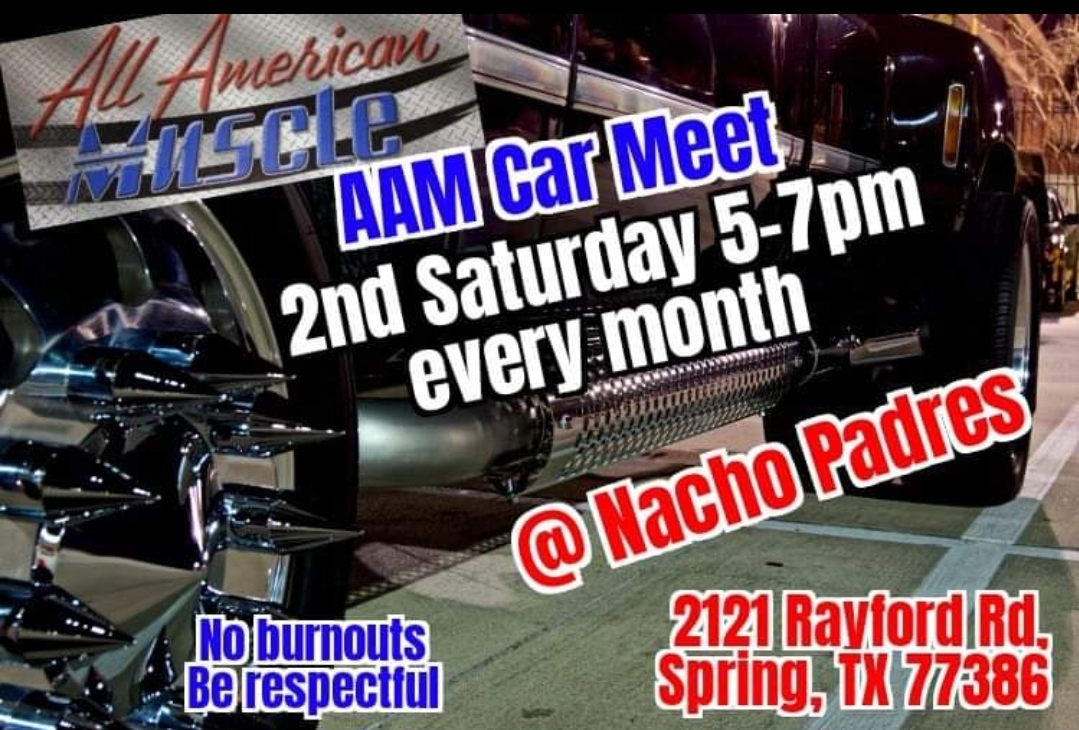 We’ll be hanging out the 2nd Saturday evening every month from 5 pm-7 pm at Nacho Padres on Rayford Rd in Spring, Texas. We’ll probably get there a little earlier and eat around 4 pm, and then hang out from 5-7pm in the parking lot of the Memorial Herman clinic (next door), on the west side of the driveway that leads to Nacho Padres from Rayford. Nacho Padres has graciously allowed us to hang there on the 2nd Saturdays every month. Last-minute time changes are always listed on the Facebook page – ALL AMERICAN MUSCLE CARS