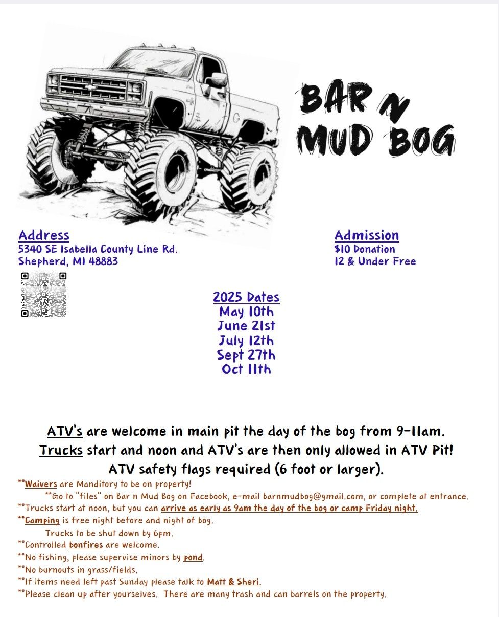 Bar n Mud Bog located at 5340 SE Isabella County Line Rd., Shepherd, MI 48883. In memory of Marvin Kendall (1951-2021). Bring friends and family to the local bog and have fun playing in the mud or socialize and watch the fun.