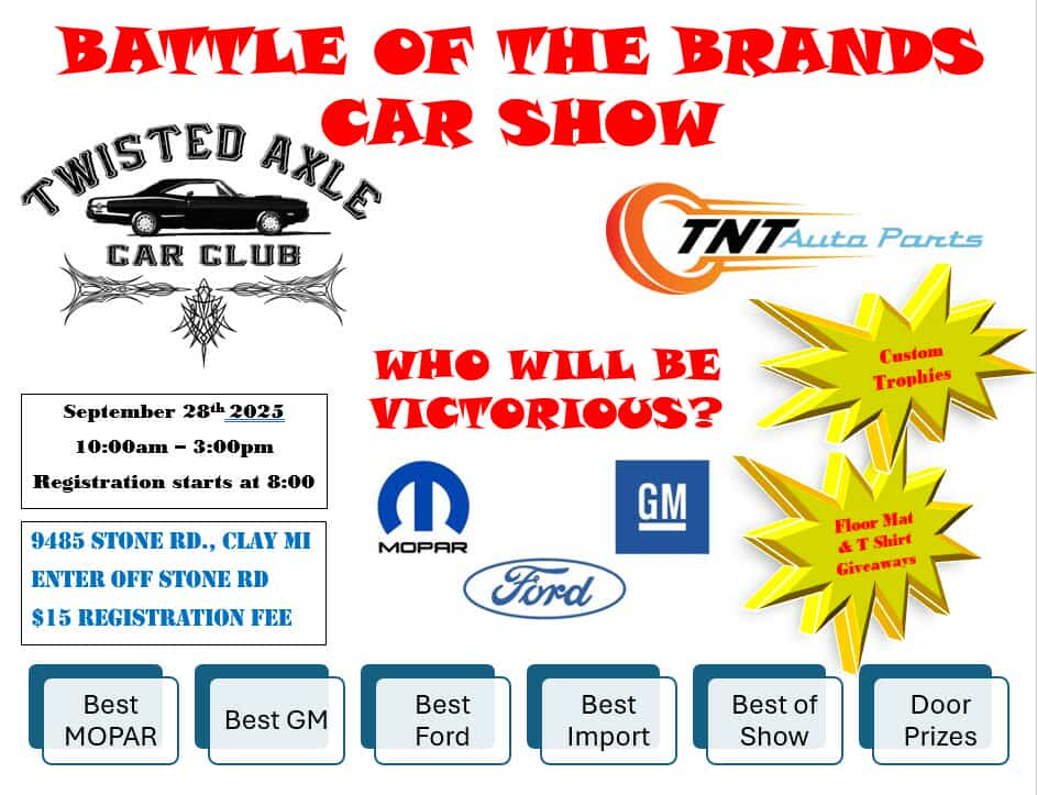 Twisted Axle Car Club is happy to announce that we will be partnering with TNT Auto Parts, September 28th, to do a BATTLE OF THE BRANDS, car show ($15 registration at the gate). This will be a family and friends car show for all. Michigan has a very diverse car culture, so come on out and bring your ride and let’s have a little fun showcasing the different brands out there. We will have a couple food trucks on site, so bring your appetite as well!