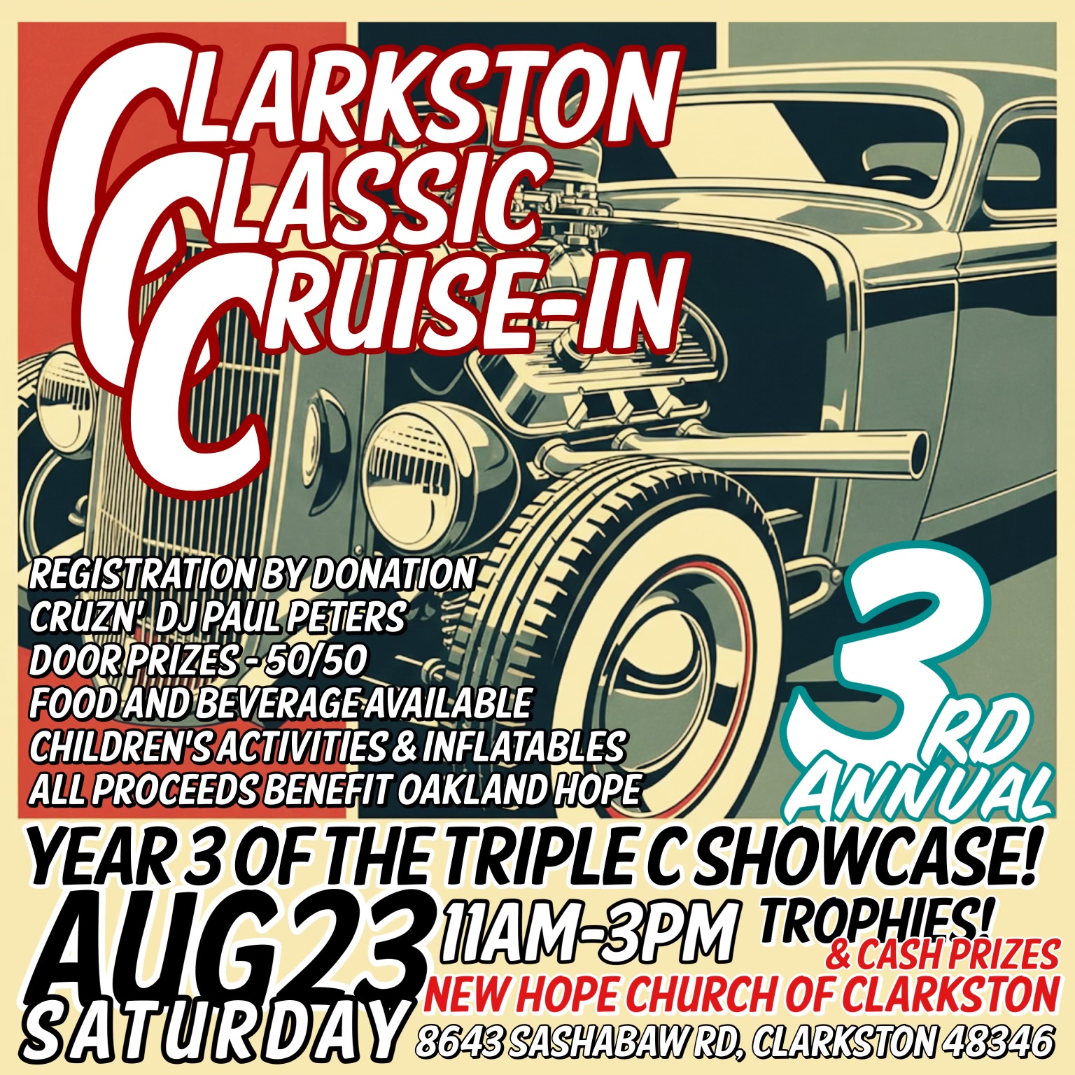 New Hope Church of Clarkston. Tons of parking on asphalt or grass. Cruzin’ DJ Paul Peters spinning all of your favorite oldies, 50-50 raffle, door prizes, tons of trophies, including one special trophy plus $50 cash judged by the pastor and sponsored by Feldman CDJR of Clarkston. Tons of activities for the kids, including inflatables. Food and beverage on site. Registration is done by your gracious donations.