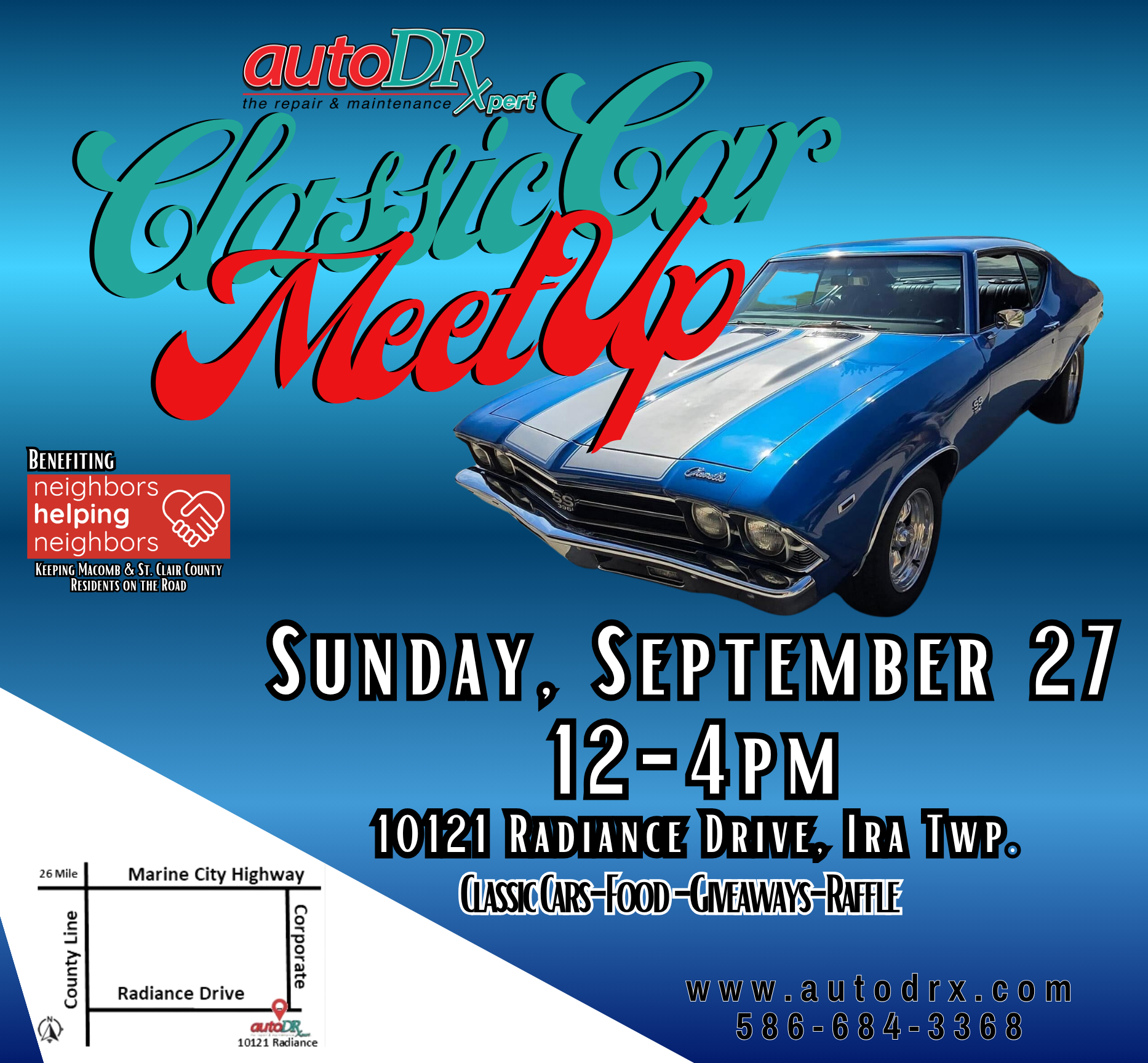 You are invited to participate in Auto DR’s third annual Classic Car Meet Up – benefiting “NEIGHBORS HELPING NEIGHBORS” – assisting Macomb & St. Clair County Residents with car repairs at no cost to them. Highlights: Classic Cars; Food; Raffles/Give-A-Ways; Live Music. Let us know if you would like to bring your car and be part of our celebration – call us at 586-684-3368 x103.