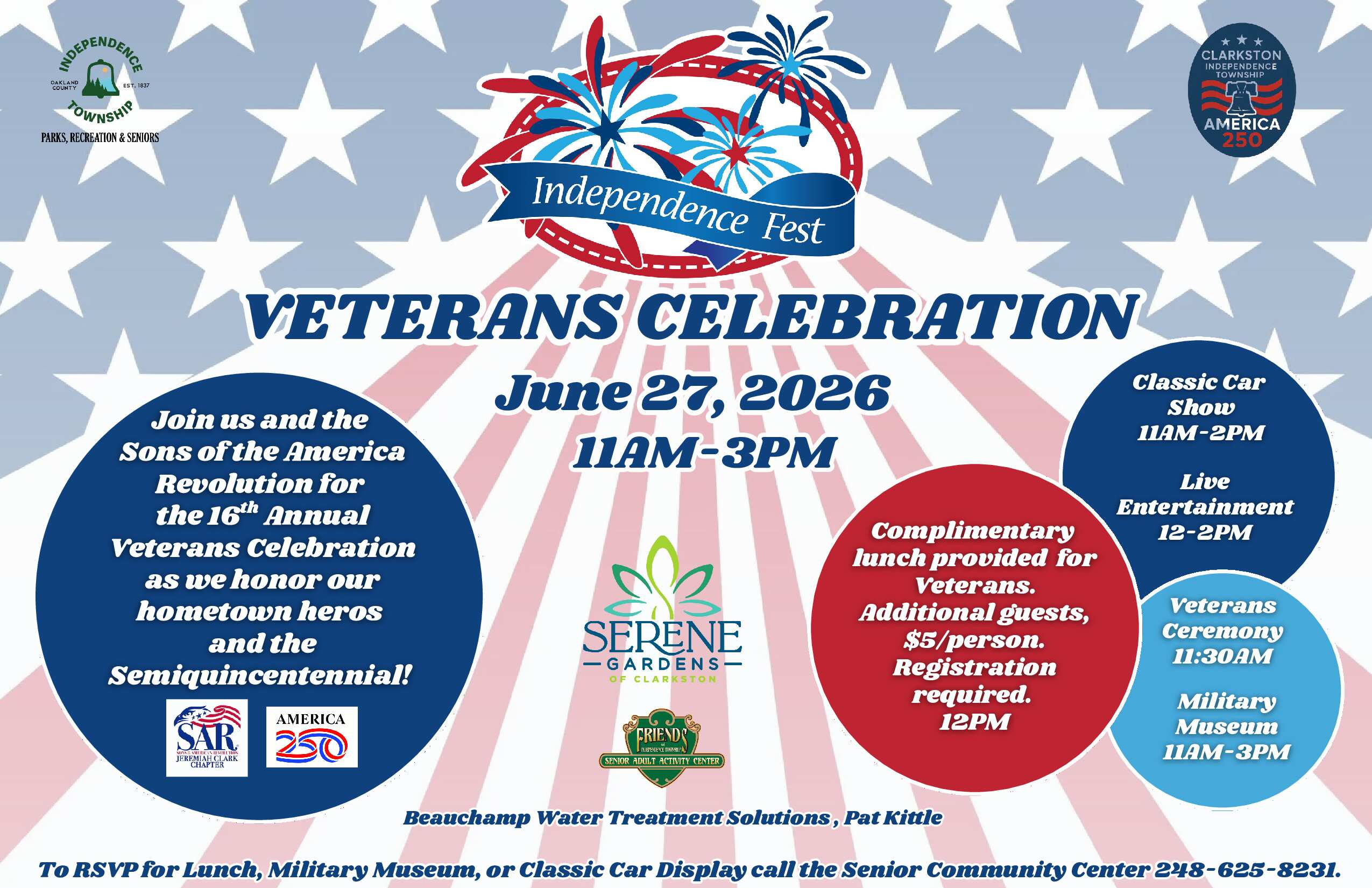 Classic Car Display 11am-2pm with live entertainment 12-2pm. Car display is part of Independence Fest – Veterans Celebration, 11am-3pm. Veterans Ceremony will start at 11:30am, so we ask that all cars be parked by 11am. You do not need to be a Veteran to participant. Complimentary lunch provided for Veterans with additional guest $5/person. Registration required.