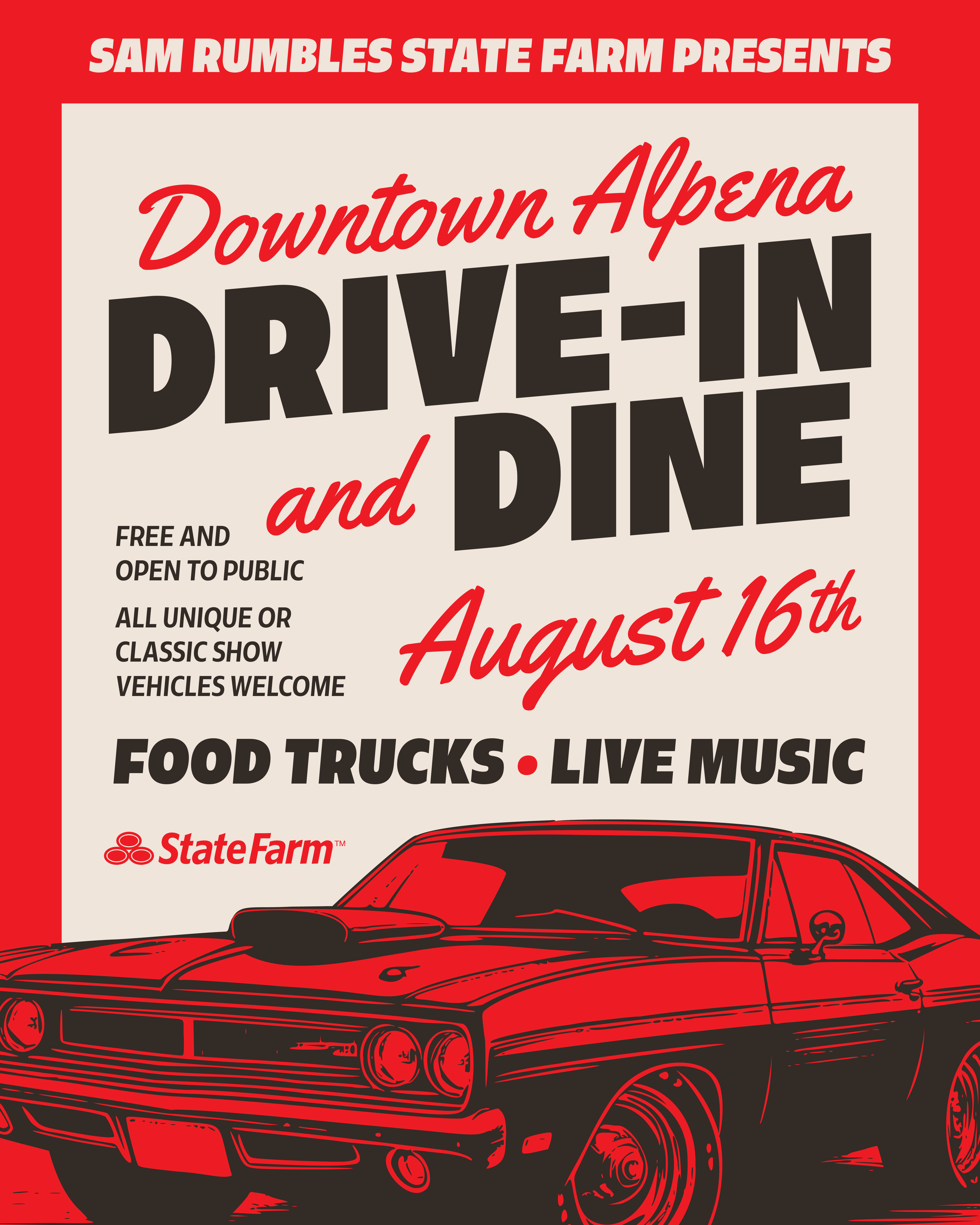Join us for the annual Downtown Drive-In & Dine Car Show in Downtown Alpena on Saturday, August 16 from 4 PM to 7 PM! All car enthusiasts are welcome—whether you have a classic, or a unique modern vehicle, we invite you to showcase your wheels. No pre-registration is required! Participate in the excitement by casting your vote for the Voter’s Choice Award. The winner will be announced at 7 PM.
