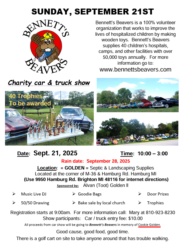 Come to Hamburg Michigan for a good time, beautiful vehicles, and great cause. All ages, makes and models welcome. Bennett’s Beavers is a 100% volunteer organization that makes wooden toys for hospitalized children. There will be lots of trophies, good food, 50/50, DJ, goodie bags and door prizes. We have 30 acres for those of you that need to trailer your special baby. There is a golf cart on site for those that like to look at the cars but have trouble walking. Rain date is 9-28-25.