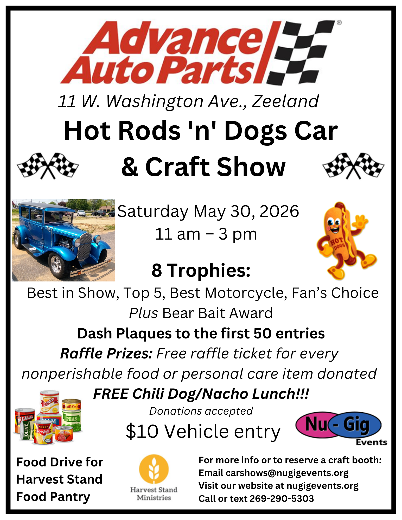 Car and Craft Show to raise support for a local food pantry! Free chili dog lunch, donations accepted. Raffles/prizes, DJ music, dash plaques for the 1st 50 entries, and trophies. Free raffle ticket for every nonperishable food or personal care item donated. $10 donation to show your car and be considered for a trophy. Craft Show opens at 9am, car registration starts at 10am, Car Show 11am-3pm.