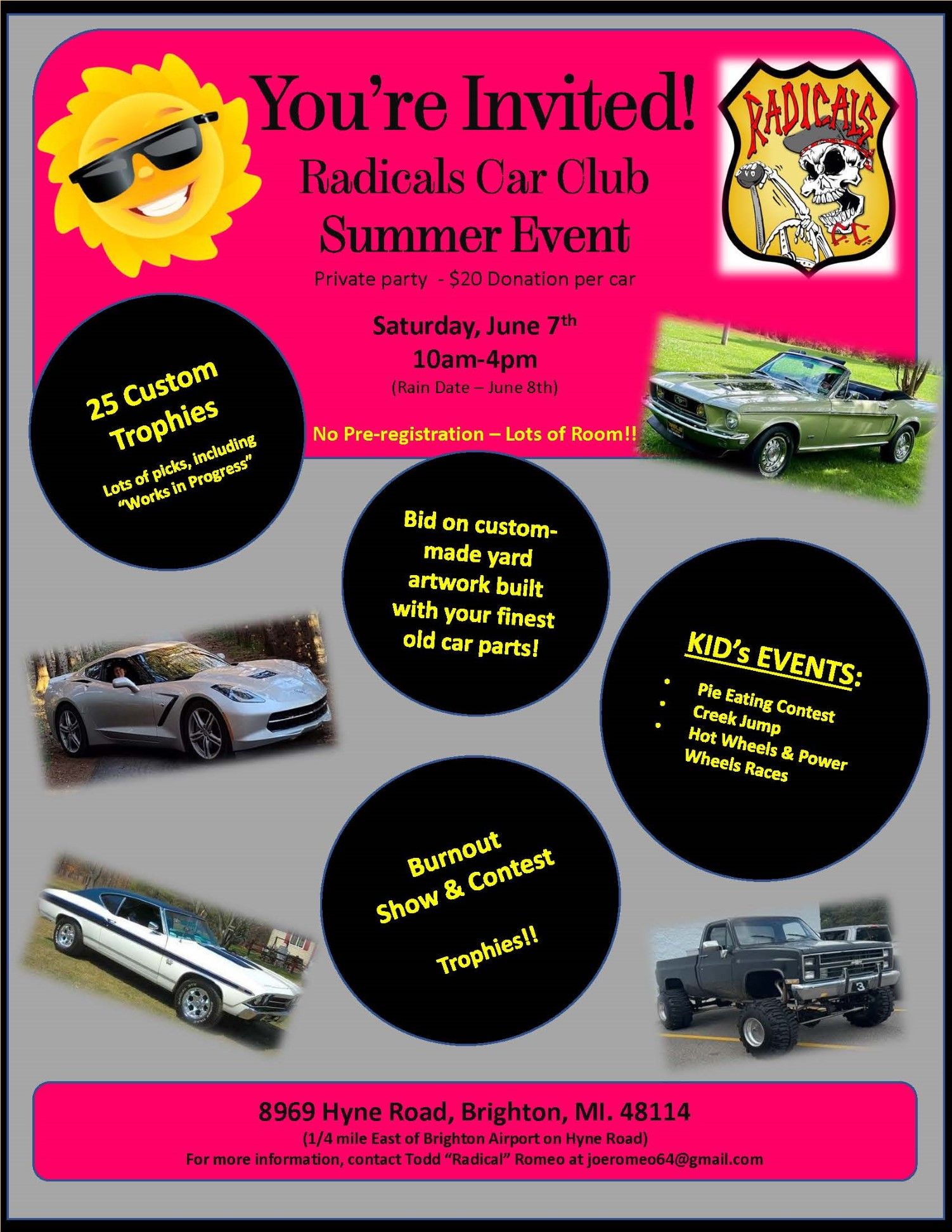 kick off the summer with the Radicals. car show, burnouts, kids events. 5 acre private home. Hand made custom trophies. Custom yard art for raffle. Private event for all my friends read this you’re invited. Please make a twenty dollar donation per car upon entering. We will also have some great Home Cooked food plates.