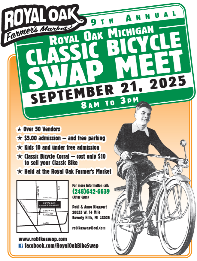 This will be our ninth “Classic Bicycle Swap Meet” at the Royal Oak Farmer’s Market.