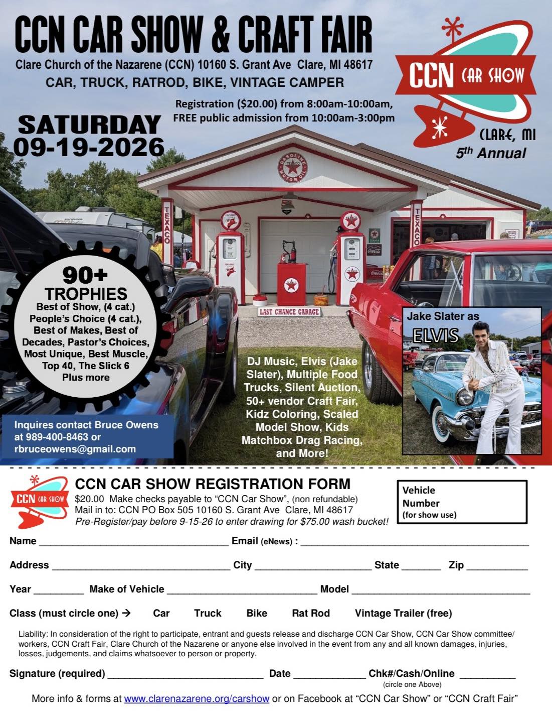 CCN Car Show & Craft Fair September 19 @ 10:00 am - 3:00 pm Clare Church of the Nazarene 10160 S Grant Ave, Clare, MI, United States For more information, contact (989) 400-8463