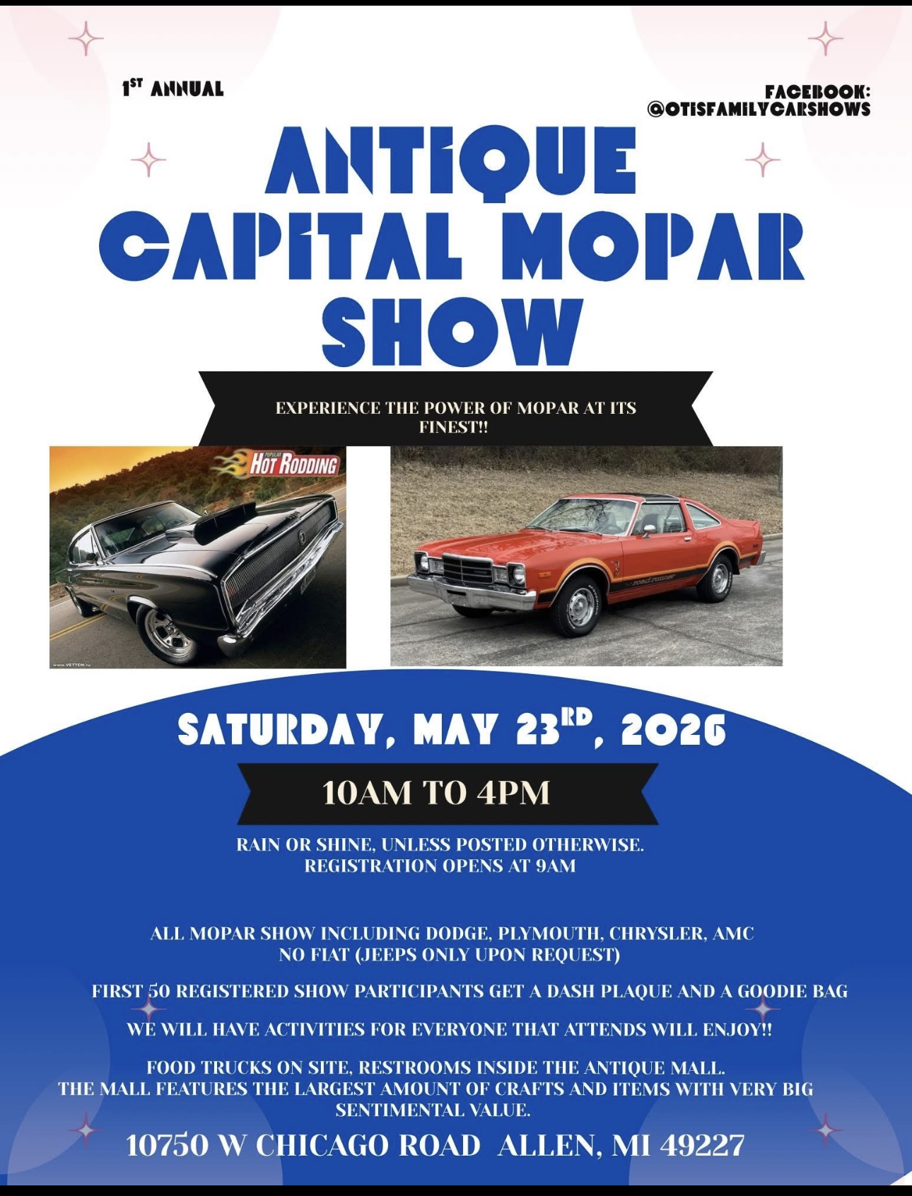 Antique Capital Mopar Show May 23 @ 10:00 am - 4:00 pm Hog Creek Antique Mall 10750 W Chicago Rd, Allen, MI For more information, contact (517) 869-2250
