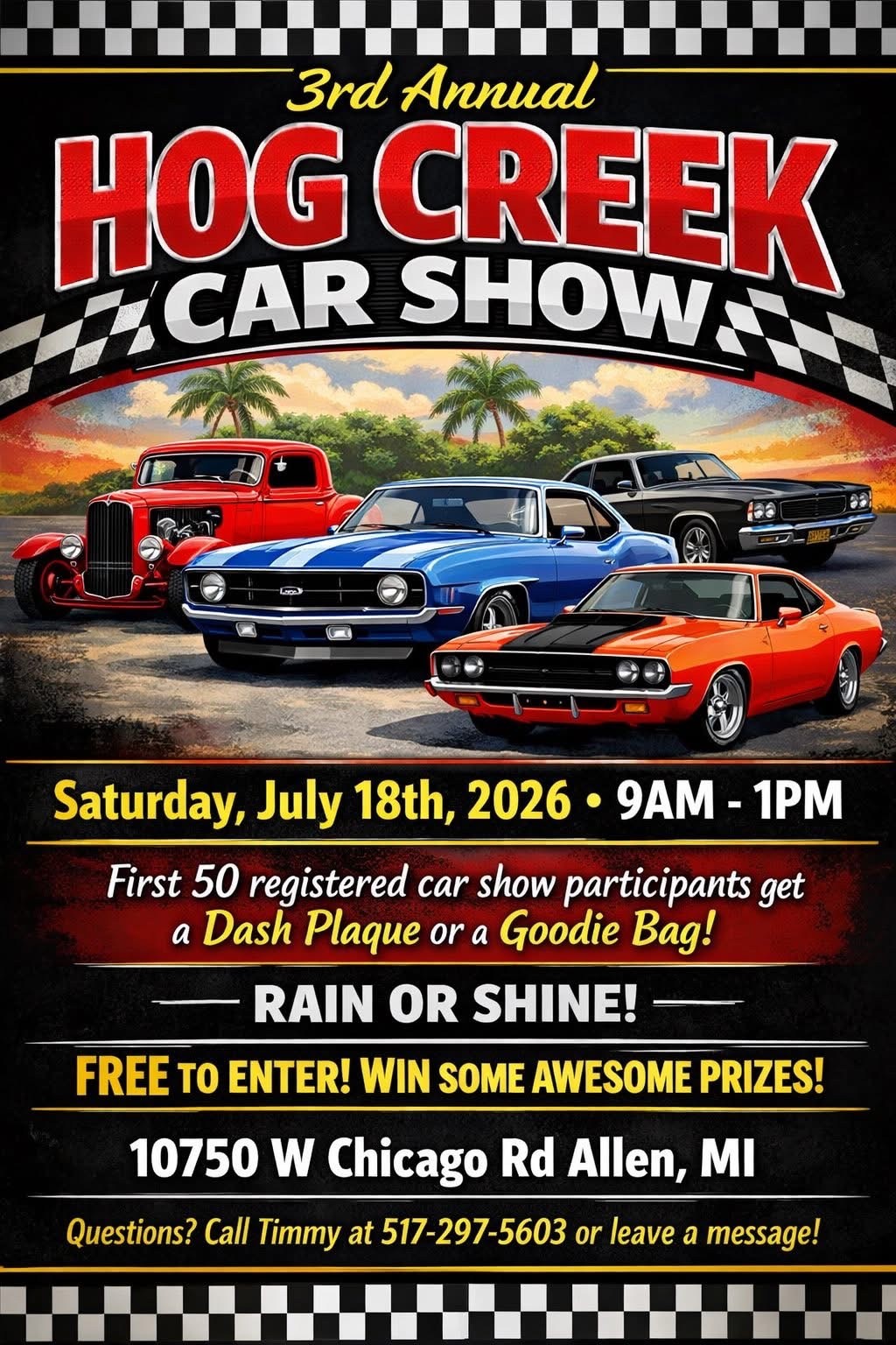 3rd Annual Hog Creek Car Show July 18 @ 9:00 am - 1:00 pm Hog Creek Antique Mall 10750 W Chicago Rd, Allen, MI For more information, contact Timmy at (517) 297-5603