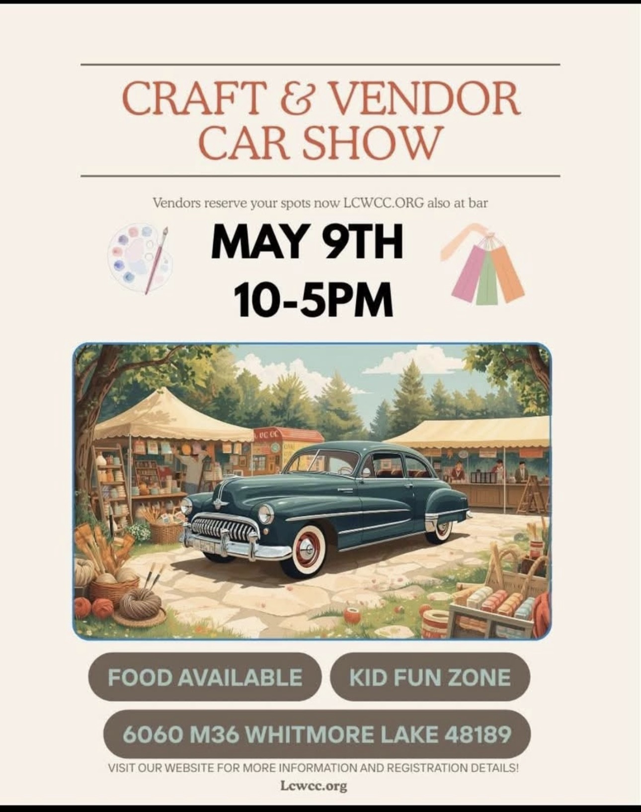 Craft & Vendor Car Show May 9 @ 10:00 am - 5:00 pm Livingston County Wildlife Conservation Club 6060 E Michigan 36, Whitmore Lake, MI For more information, contact (810) 231-1811 or visit https://www.lcwcc.org/