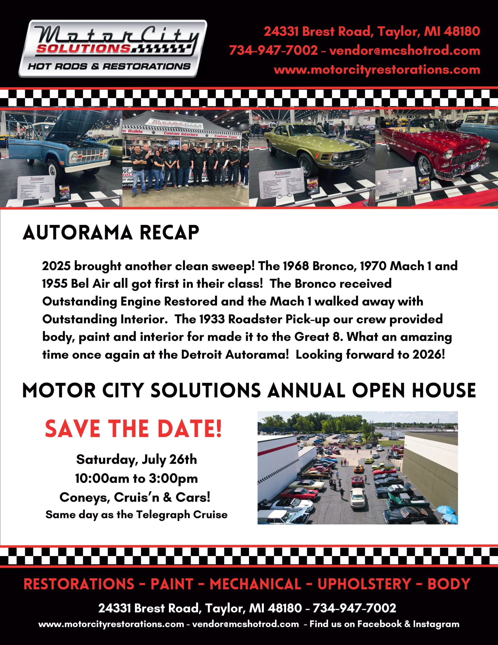 Motor City Solutions Open House 07/26/2025 @ 10:00 am - 3:00 pm Motor City Solutions 24331 Brest Rd, Taylor, MI, United States For more information, contact (734) 947-9447