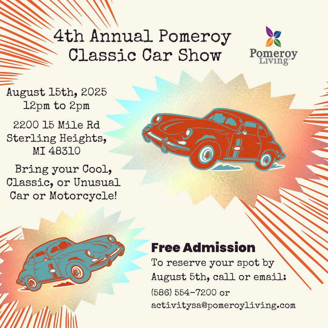 Pomeroy Classic Car Show 08/15/2025 @ 12:00 pm - 2:00 pm Pomeroy Living Center 101 E Scripps Rd, Lake Orion, MI For more information, contact (586) 554-7200 or activitysa@pomeroyliving.com